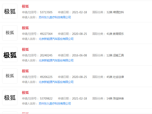 根据中国商标网信息显示,从2016年6月8日起截止到2020年9月8日,北京新能源汽车股份有限公司陆续申请了“极狐”、“北极狐”、“南极狐”等商标,所申请商标均已注册,但仍有大量的商标类别“极狐”、“北极狐”、“南极狐”被其他机构注册。有趣的是,“极狐阿尔法”多个商标竟然在2021年被其他机构或个人抢注成功。