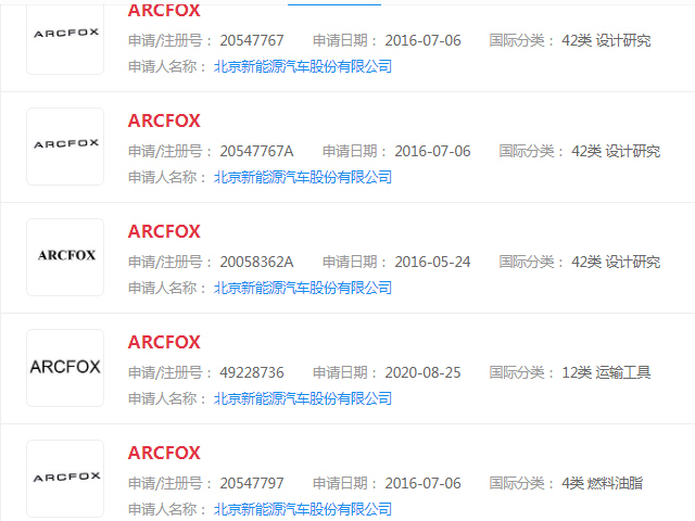 根据中国商标网信息显示,从2016年3月24日起截止到2020年8月25日,北京新能源汽车股份有限公司陆续申请了“ARCFOX”商标,除第1类、2类、23类、40类、44类、45类商标空白外(没有机构申请),其申请商标部分被国家商标局驳回外,大部分商标已注册成功,但仍有大量的“ARCFOX”商标被其他机构注册。