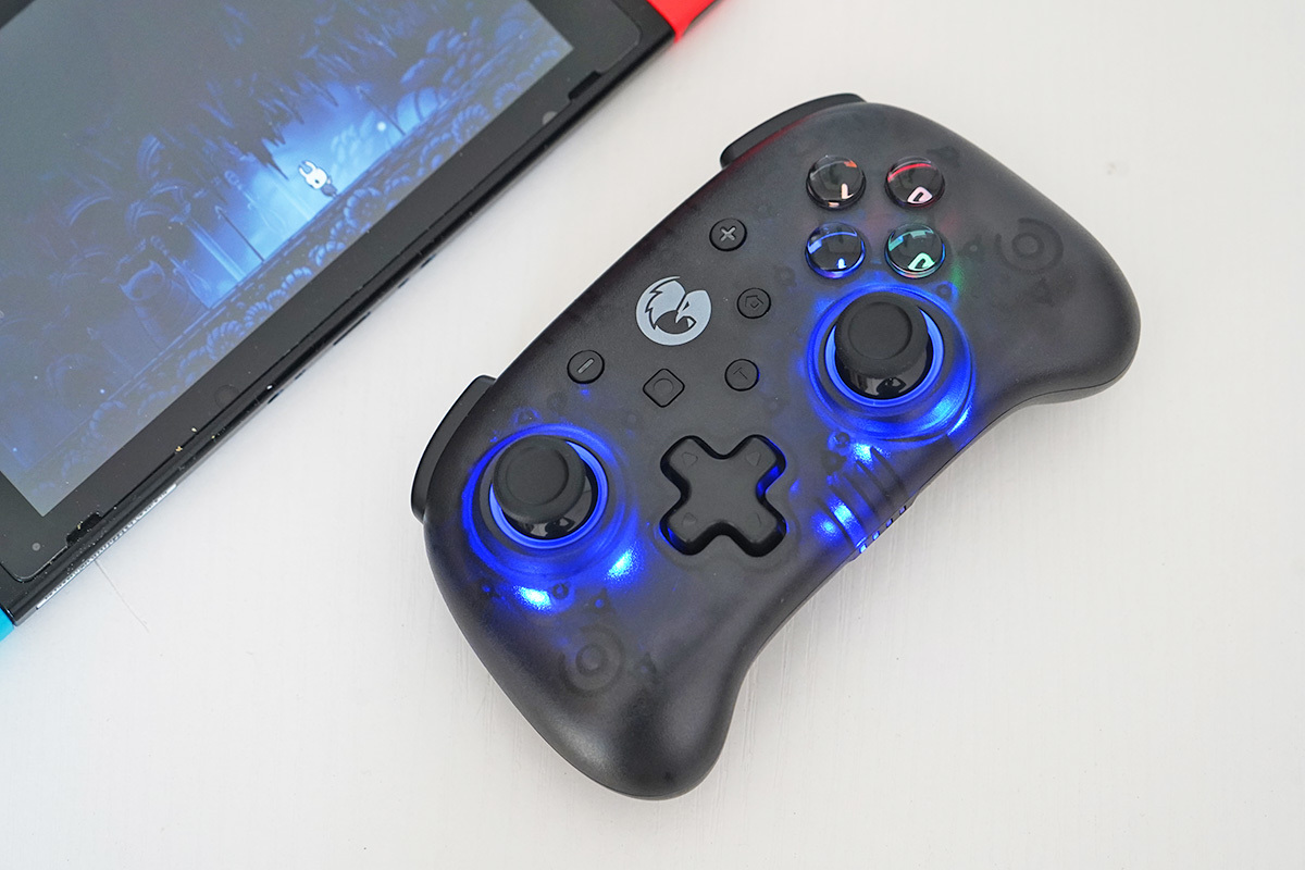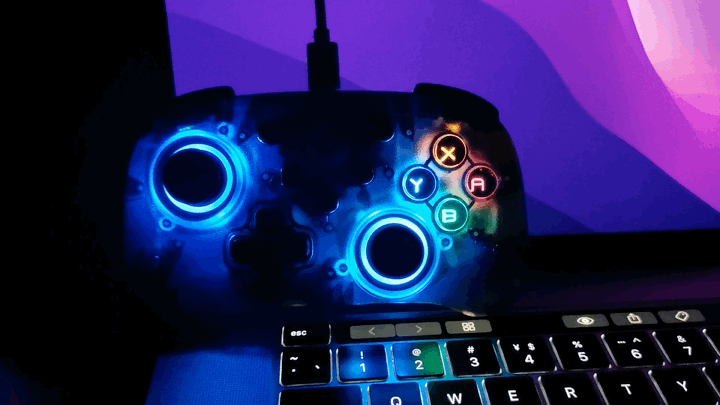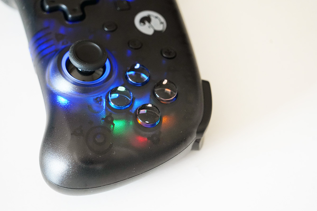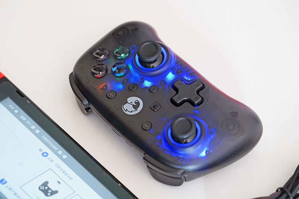 GAMESIR T4mini的外壳采用半透明的设计,ABXY键与D-Pad键都有彩色的LED灯作为装饰,D-Pad更是支持9种色彩或8色循环呼吸灯的展示。
