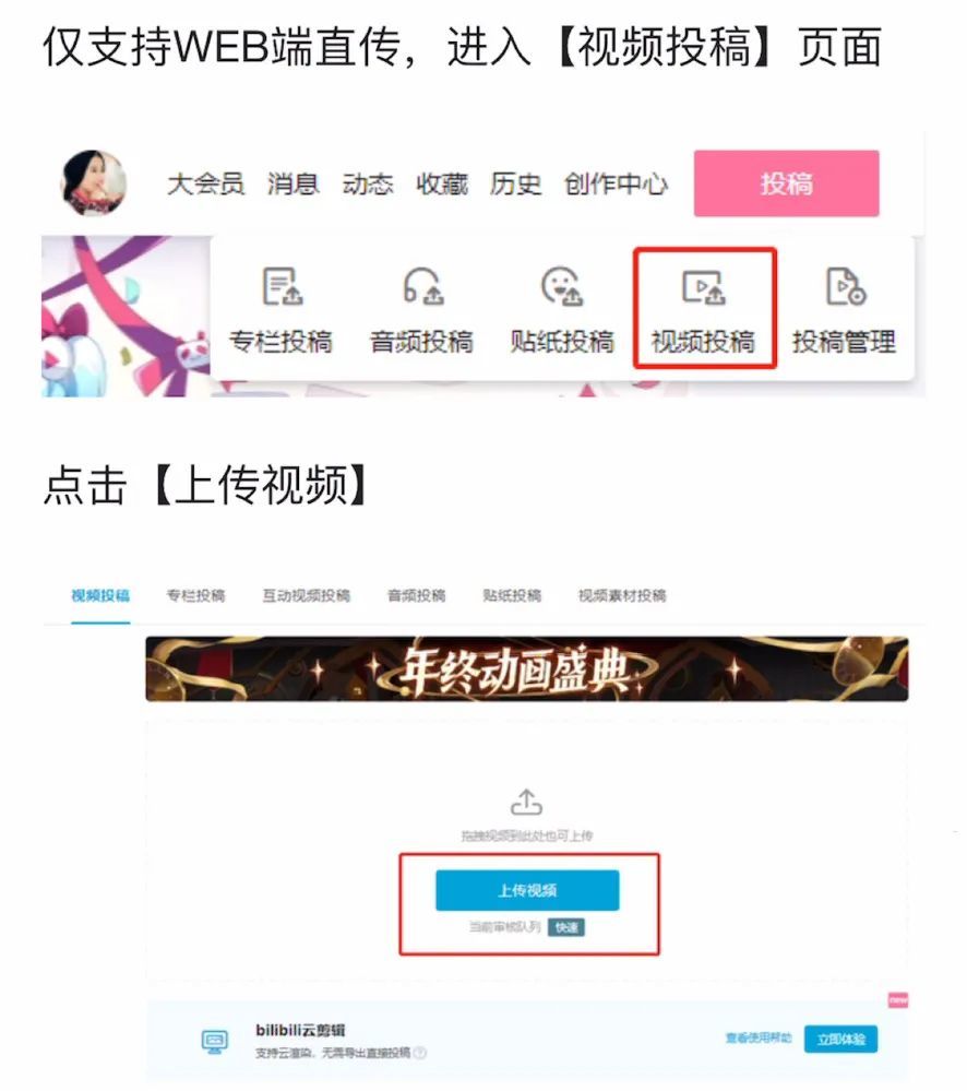 上传流程方面,8K超高清视频仅支持WEB端直传,进入【视频投稿】页面,点击【上传视频】。