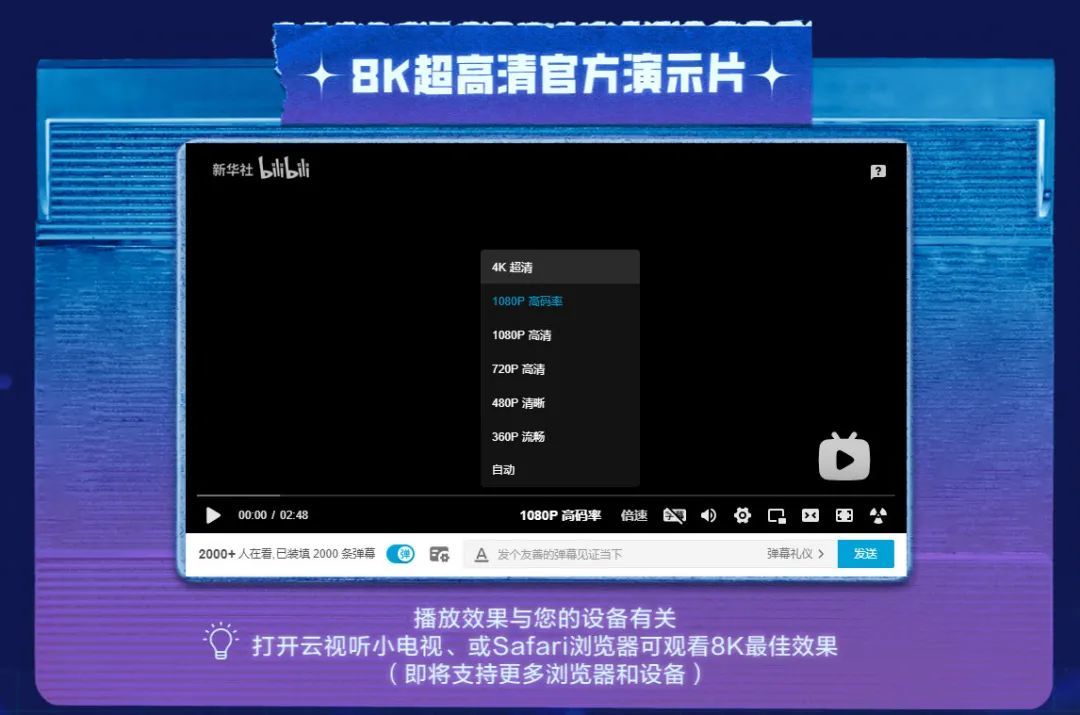 WEB端观看方式:在观看8K画质视频时,点击底部清晰度切换按钮,选择8K超高清,即可享受超高清画质体验。