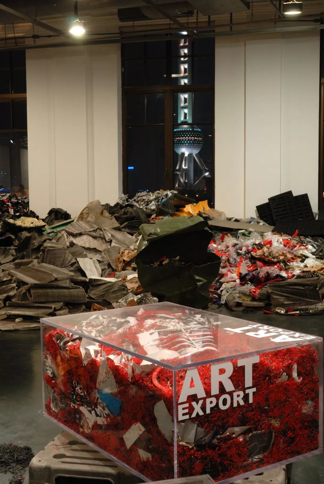 刘建华将洋垃圾经消毒处理后封入有机玻璃盒内,并标注上“艺术品出口”的字样,把垃圾通过艺术加工的方式再次“输出”,使不再有用的物品重新被注入一种对全球化的反思可能性。