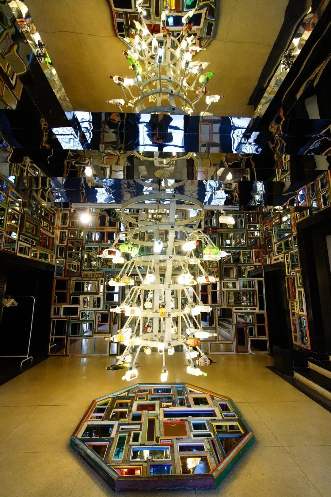 宋冬在北京收集了形形色色的旧窗框,并装以镜面代替了原本的窗玻璃。另一件也是由废弃玻璃酒瓶制作的装置作品《无用之用:瓶架大哥》与《镜厅》在美术馆空间内辉映组成了一个剩余价值的迷幻现实场域。