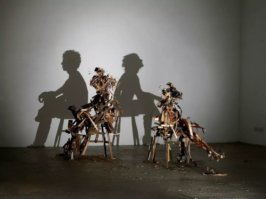 这对曾经的垃圾艺术伴侣以一堆废弃木材和金属材料记录了两人复杂而孤立的关系。混乱的废弃物杂乱堆叠在一起,但在一道无可躲避的光影投射下,形成了一对人类男女背对而坐的悲伤影像,这两者的形象,同构了有关幻觉、虚无、消耗与投射的欲望波浪。