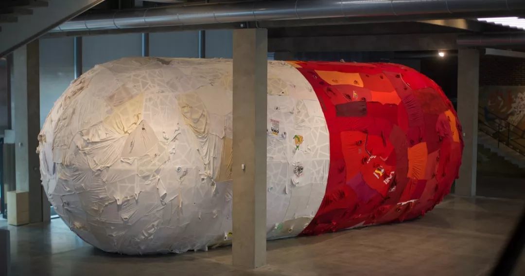尹秀珍收集了莫斯科人的旧衣服,缝制成一颗巨型胶囊药丸,人们可以走入药丸内部,那些原本承载着俄罗斯人生活背景和生命气息的衣物被再度拼接组合在一起,形成一种新的关系和场域,更包含了一种从历史中寻求自我治愈的深意。
