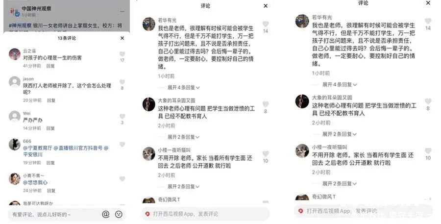 北塔中学教师打学生视频发布后,网友纷纷斥责视频中当事老师的行为。有网友称,“俗话说‘打人不打脸’,当着全班学生面扇孩子耳光,会留下心理阴影的。”“学生也有尊严,当众扇耳光太伤人自尊了。”“这种老师心理有问题,把学生当泄愤的工具,已经不配教书育人。”有网友留言。