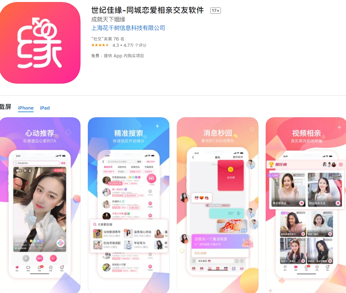 企查查 App 显示,世纪佳缘关联公司为上海花千树信息科技有限公司,该公司成立于 2004 年。世纪佳缘曾被称为“中国最大的严肃婚恋网站”,曾获得真格基金、启明创投等机构的投资。2011 年 5 月 11 日,世纪佳缘登陆美国纳斯达克股票市场,成为国内首家上市的在线婚恋交友平台。2015 年 12 月,百合网全资子公司收购世纪佳缘,世纪佳缘随之私有化退市。