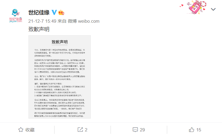 下面是世纪佳缘在 12 月 7 日发布的致歉声明