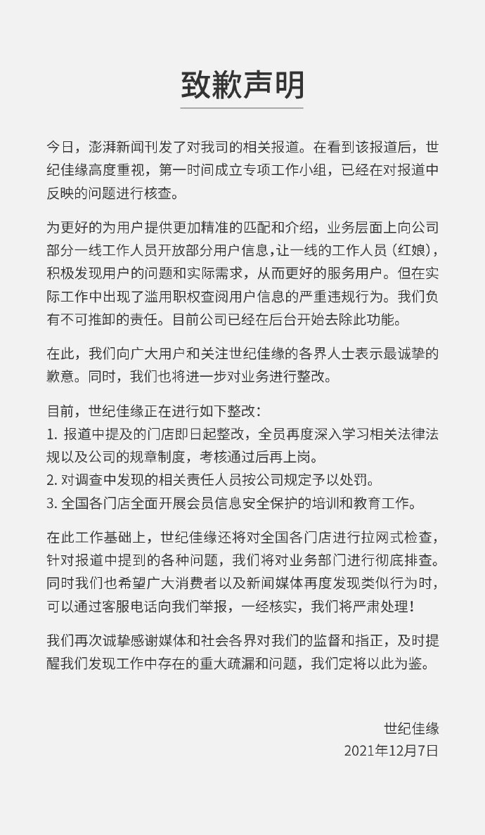 在此,我们向广大用户和关注世纪佳缘的各界人士表示最诚挚的歉意。同时,我们也将进一步对业务进行整改。