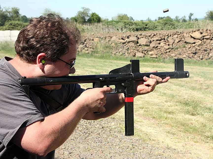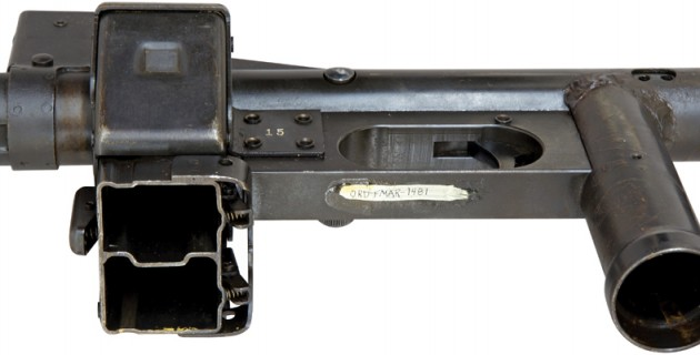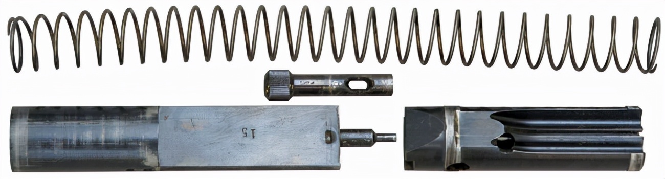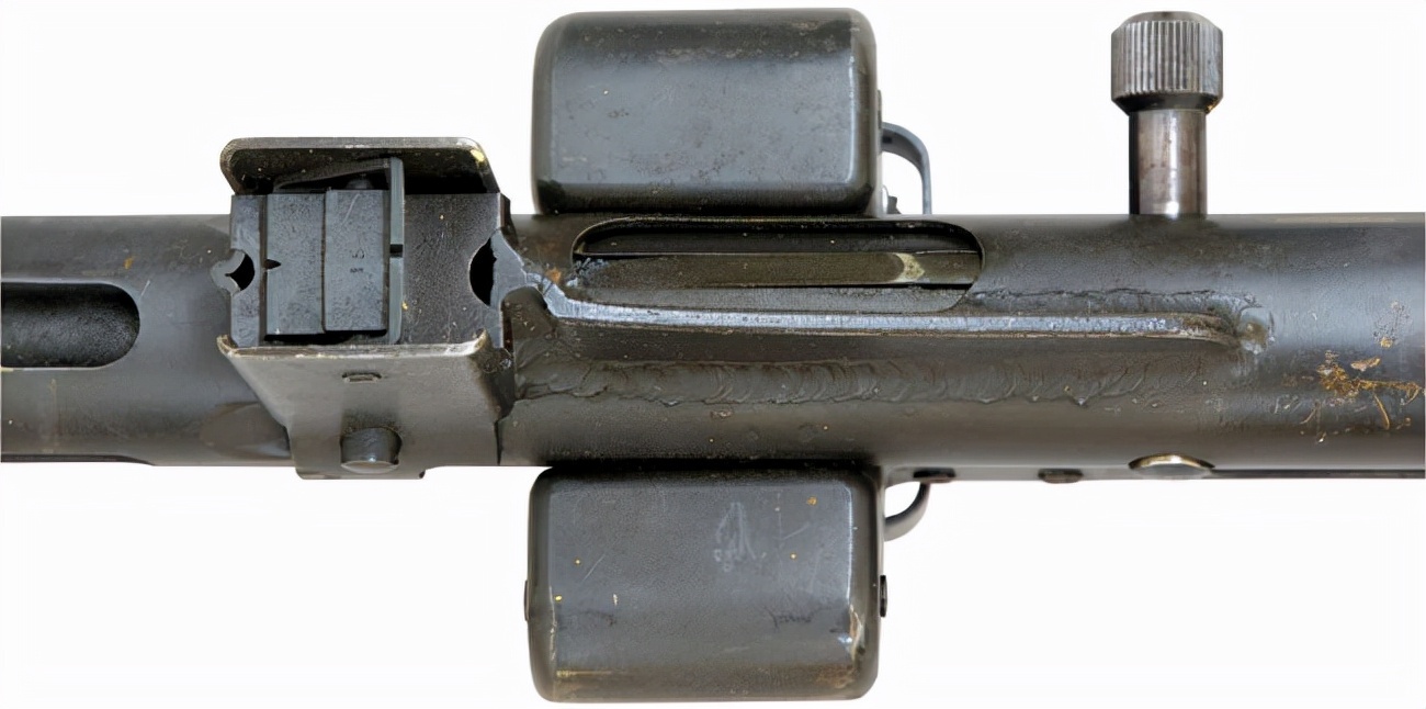 这把枪用的是当时已经成熟了的自由枪机原理,使用的是9*19mm枪弹。枪的机匣内部,也就是两个大铁疙瘩和一个小铁疙瘩,加上一根复进簧就完事了。对,就这么简单,就这点东西,然后把这些东西塞到一根铁管子里,加上枪管、枪管套筒开了散热槽,再焊上一根短管当握把,加上一根短管当枪托,这把冲锋枪的雏形就出现了。