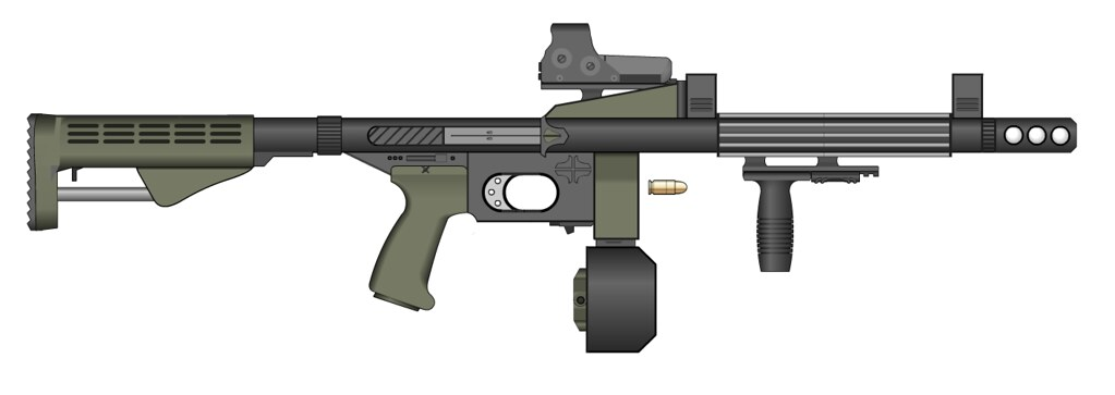 国外也有人给这把枪做了个现代化改装的图纸,一个可伸缩枪托、光学瞄具、垂直握把、手枪握把、弹鼓等。乍一看,这枪还是比以前的原版好看多了。