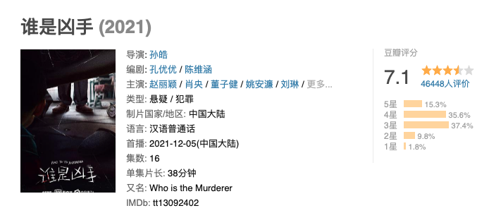 不过,《谁是凶手》的评分出炉后,所有关注该剧的人都松了一口气,因为该剧评分高达7.1分,远远超过今年其他几部悬疑剧的评分。