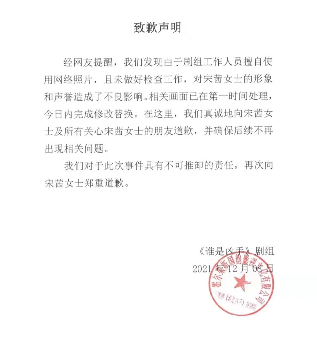 但谁也没有想到,在开播后的第四天,《谁是凶手》再次道歉了。而此次道歉的理由,是因为有网友发现《谁是凶手》在剧中发现了该剧的竞争者《风起洛阳》女主宋茜的照片。开始儒爷还以为这是要来个梦幻联动呢!但随着宋茜后援会的发声,儒爷才知道,原来,这并不是所谓的梦幻联动,而是侵权了。