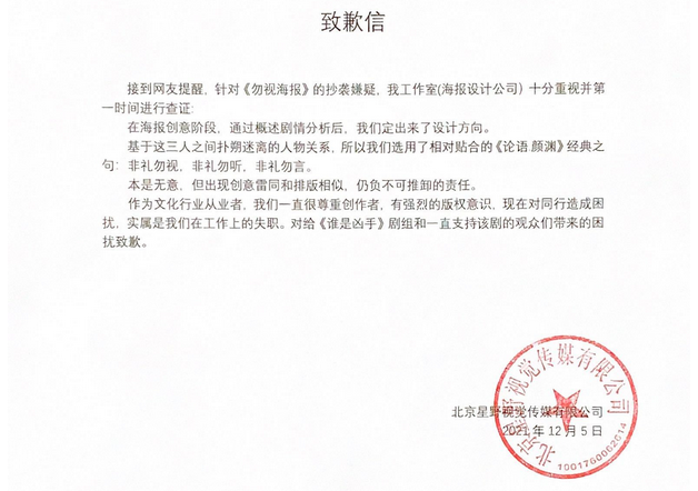 众所周知,《谁是凶手》开播当天,就因为海报涉嫌抄袭而上线道歉。当晚海报设计方发布道歉信,表示对「出现创意雷同和排版相似」「负不可推卸的责任」,解释称海报创意是基于主角三人之间扑朔迷离的人物关系,选用了《论语·颜渊》的经典之句「非礼勿视,非礼勿听,非礼勿言」。