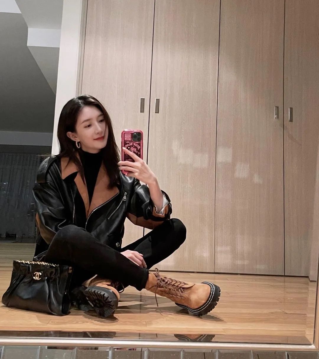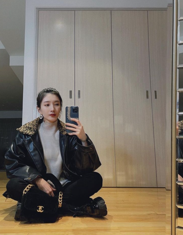 小江同学的雪纺衬衫有一定垂感,但是和皮裙的光泽度相差甚大;羊毛衫+皮衣外套选用不同材质的服装进行搭配,突出了反差感,高级感满满就是这样来哒~