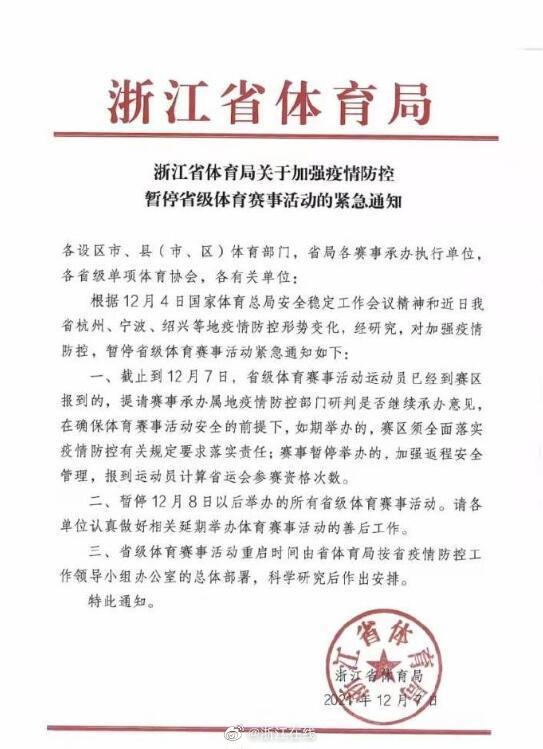 【浙江暂停举办所有省级体育赛事活动】浙江省体育局发布“紧急通知”:暂停12月8日以后举办的所有省级体育赛事活动,重启时间由省体育局按省疫情防控工作领导小组办公室的总体部署,科学研究后再作出安排。(小时新闻)