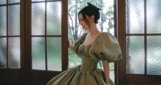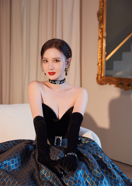 而她身上穿着的黑色法式礼服又增添了优雅气质。只见她的上半身露出优美的肩颈线,胸口开得很低,露出玲珑有致的丰满身材,手臂上戴着黑色长手套,与裙子相呼应,非常和谐。