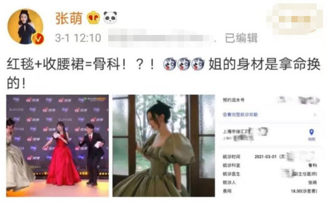 当场晚会结束后,张萌因为勒得过紧,肋骨发疼,就直奔医院挂了骨科的号。虽然没有太大的问题,但是也是给众多女明星或者普通人一个警醒,不要用命去换美。