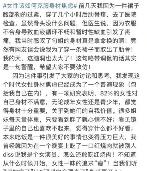 我们不用苛责,但是可以学会欣赏。张萌在“肋骨”事件发生之后,也发长文对身材焦虑进行了反思,在文中她提到女性的身材焦虑已经成为了这个时代的普遍现象,自己曾经因为在一个晚宴上吃了一口红烧肉就被别人说:“一个女演员怎么还敢吃红烧肉”。
