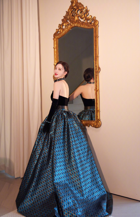 她的裙子下摆是蓝黑色格子花纹,用裙撑撑起了蓬蓬裙的感觉,走路时非常轻盈。