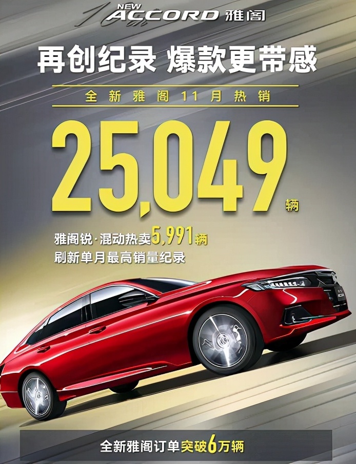 凯美瑞前十个月卖出了159544台,10月份超出了两万台,雅阁前十个月卖出了148081台,十月份卖了1.7万台。两者之间的差距并不大,只是十月份有些明显,但是刚刚过去的11月份,雅阁的销量迎来了大爆发,据数据显示,雅阁在今年11月的销量达到了25049辆,创造了单月最高销量纪录,其中,雅阁锐·混动卖了5991台。