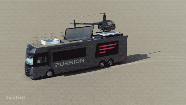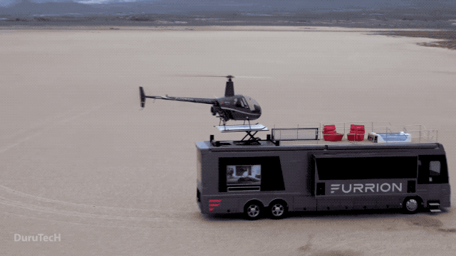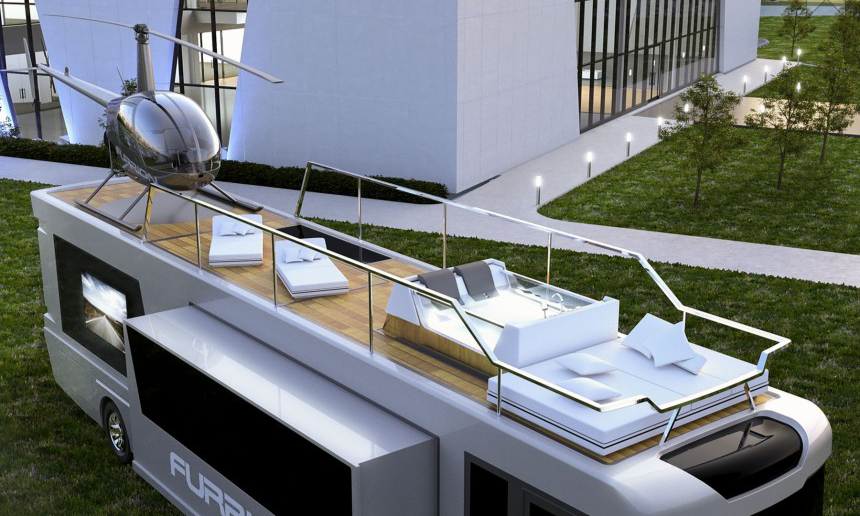 我们看过「房车装自行车、装汽车」的,不知道大家有没有看过能停直升机的房车?