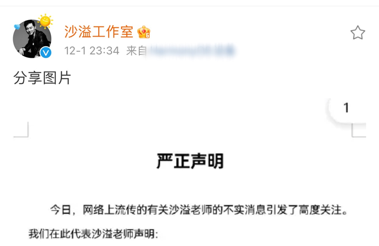 直到12月2日,沙溢工作室才发布声明, 否认近日网上的出轨谣传。