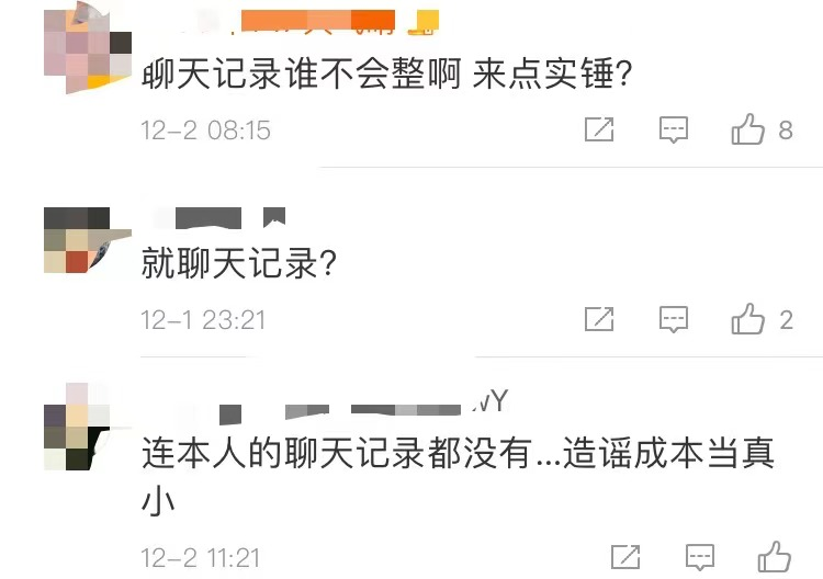 不过大部分网友都觉得是造谣,因为出轨视频、照片都没有,只有爆料的聊天记录。