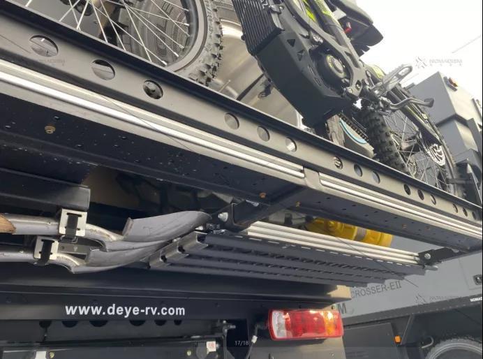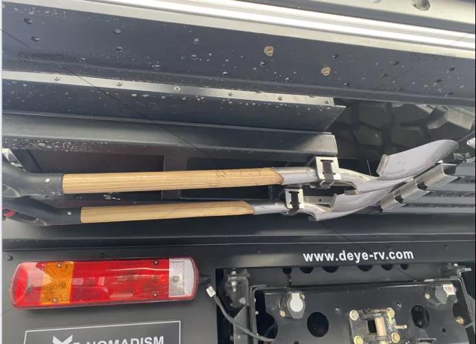 尾部摩托车挂架下方空间配上铁锹和防沙脱困板以备不时之需。