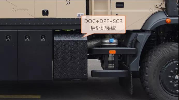 旁边就是DOC+DPF+SCR后处理系统,经过这套系统的处理车辆的尾气排放就可以到国六B的标准了,所以可以合全国上牌要求。