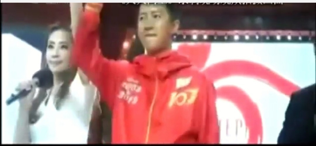 这时,韩庚经纪人快步上台几句话之后,将韩庚带离了现场。