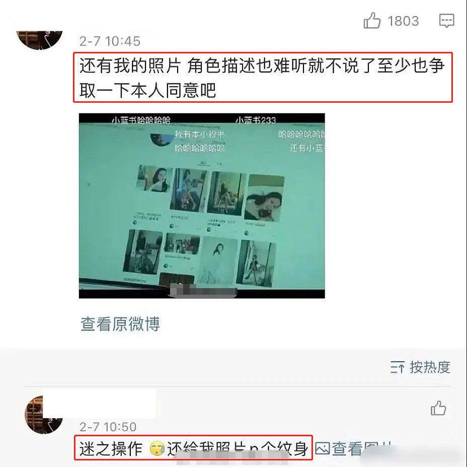 但这件事还没完,又有网友发现,自己的照片在该剧组变成了不雅照。该剧组还用非常难听的台词来形容了该网友的照片,甚至还给该网友的照片P了一个纹身,从头至尾都未获得网友本人的许可。