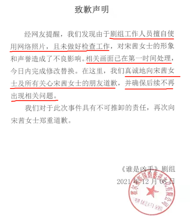 该事件迅速在网络上发酵,《谁是凶手》剧组也终于在网络上做出了回应,向宋茜和所有关心宋茜的朋友道歉了。他们称,之所以会发生这种情况,是因为工作人员擅自使用网络照片,没有做好检查造成的。他们还表示,后续不会再出现这种情况。