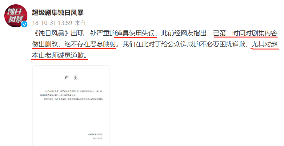 针对这个事情,该网剧也是非常迅速地就出来道歉了。说这是他们的道具使用失误,不存在恶意映射。在道歉文案里,还专程提到了赵本山。这下,就算大家不想承认这是赵本山,也只能承认了。