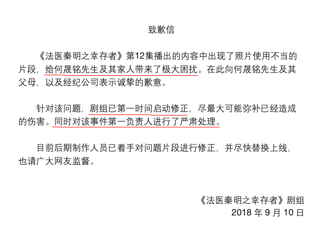 这件事情被何晟铭工作室发现了,强调剧组这样的行为并未取得何晟铭本人的同意。随后,剧组针对这次事件也选择了道歉。