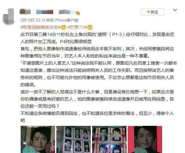 还有一档叫《密室逃脱》的综艺,竟然私自用日韩当红明星的照片出镜,还将照片p成了遗照。也引起了很多关注,使得节目组又出来道歉,并删改视频内容。