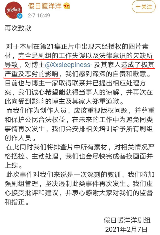 随后该剧组跟这位网友取得了联系,并对网友和家人道了歉。还表示之所以会发生这样的事,是因为剧组工作失误,以及法律意识欠缺造成的。