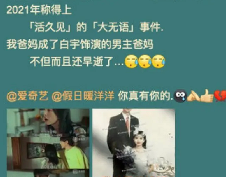 在今年2月份的时候,在姚晨和白宇主演的电视剧《假日暖洋洋》里,也发生了类似的事情。一位网友表示,自己看剧的时候,发现自己的爸妈的结婚照,成了男主爸妈的照片,还被P成了遗照。