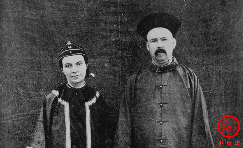 照片中的李提摩太与妻子分别穿着清朝官员和汉族妇女的服装,这样更容易与中国人打交道。英国人李提摩太1870年来到中国从事传教和教育等工作,直到1916年才回国。他广泛结交各界人物,与李鸿章、张之洞、曾国荃、左宗棠、康有为等名流关系密切。1902年,山西发生教案,慈禧太后请李提摩太协助处理,事后还请他开办山西大学堂;赐他头品顶戴,二等双龙宝星,并诰封三代。
