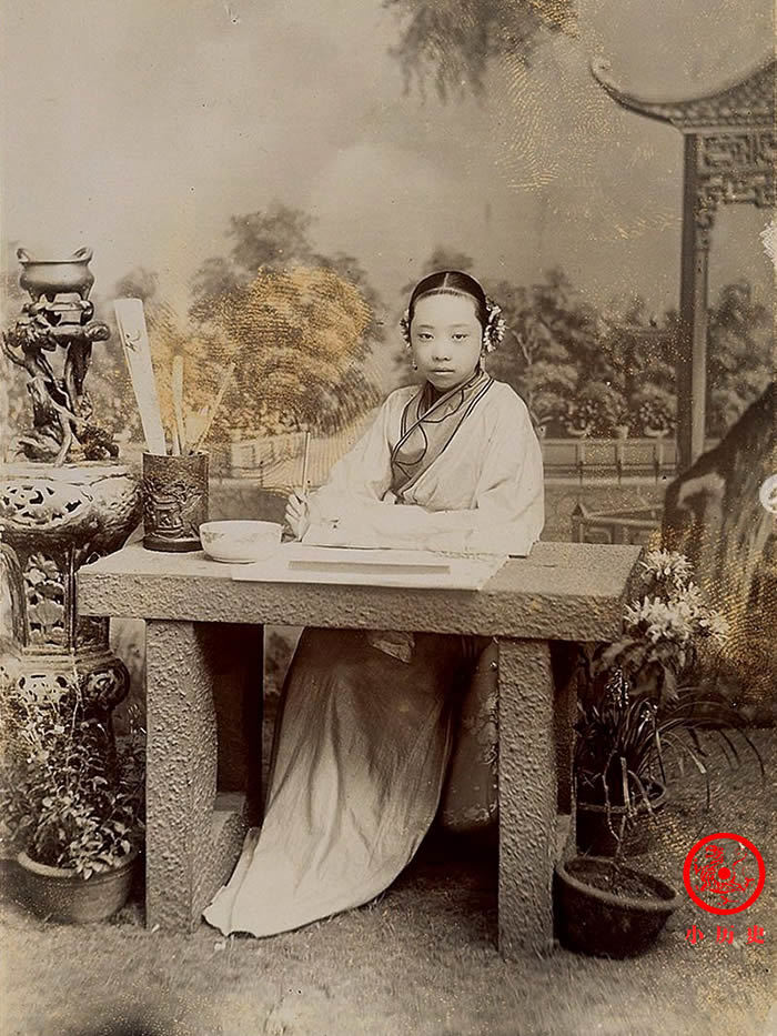 照片中的美女衣着考究,梳妆精致,显然来自富贵之家。她右手拿毛笔,左手扶纸,端坐于书桌前,展现出娴雅、知书达理的形象。