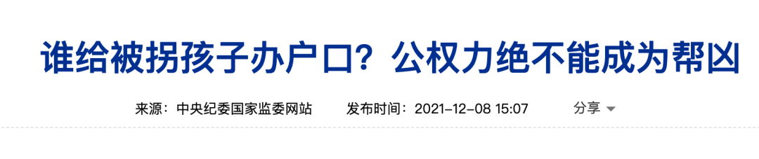 12月8日,中央纪委国家监委网站发表评论文章《谁给被拐孩子办户口?公权力绝不能成为帮凶》:电影《亲爱的》原型孙海洋找回了失散14年的儿子,认亲现场让人落泪。有媒体发文评论称,谁给被拐孩子办的户口,这一点也要查,受到舆论关注。