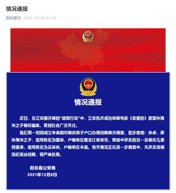 关于近日备受关注的孙海洋之子孙卓及另一儿童符建涛被拐案,山东聊城阳谷县公安局9日凌晨发布情况通报: