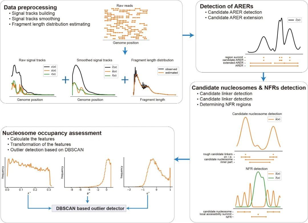 核小体排布和染色质开放性是重要的表观遗传学信号,与基因表达调控,胚胎发育,组织分化等众多生理过程间存在紧密联系。目前,ATAC-seq因其对样品要求低,处理简单,可获得多维度染色质状态信息等优势成为表观遗传学的明星技术之一。然而在稀有样本或者单细胞样本中,ATAC-seq数据仍然相对稀疏。现有生物信息学技术在稀疏的ATAC-seq数据中普遍灵敏度不足。因此,研发能适用于低测序深度ATAC-seq文库的高灵敏度核小体排布和染色质开放性检测算法是一个尚未解决的领域内难题。