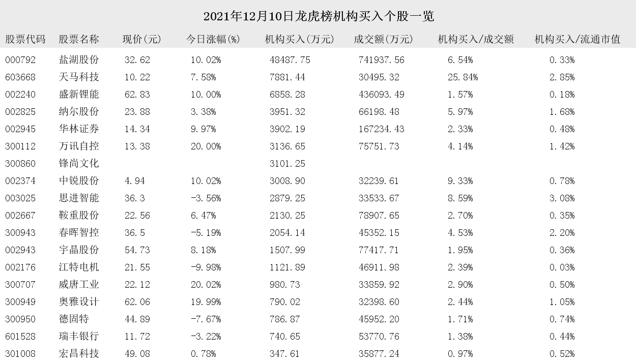 2021年12月10日盘后龙虎榜公开信息中,有31支股票出现了机构的身影。其中,有18支股票出现了机构买入,13支股票出现了机构卖出。