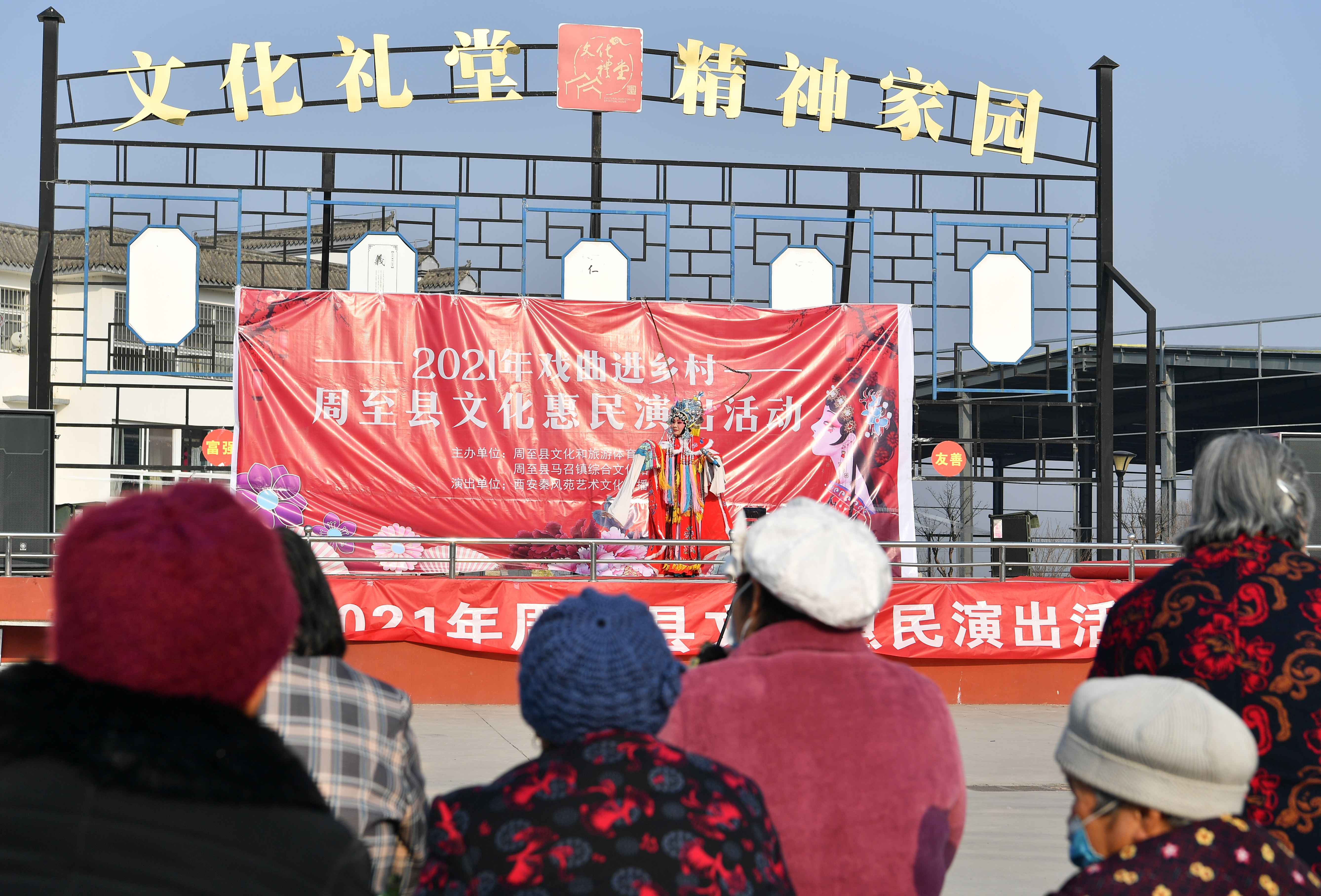 12月9日,西安市周至县马召镇安富园社区居民在社区观看演出。