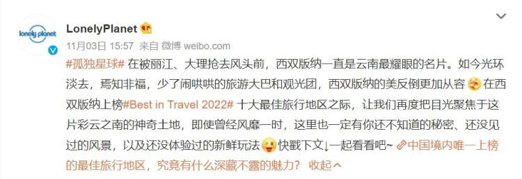 10月底,《孤独星球》评选出了“2022年度十大最佳旅行目的地”,位于彩云之南最南端的西双版纳,代表中国杀入榜单。