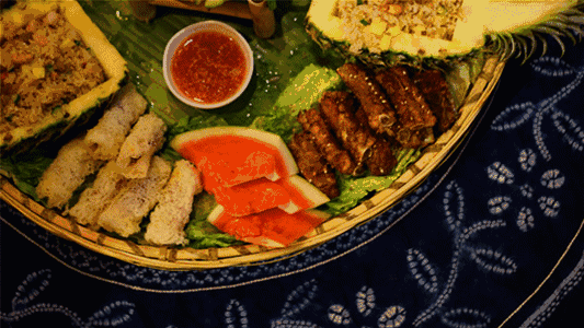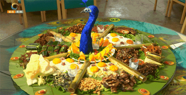 新鲜爽口、脆生生的凉拌菜开胃后,琳琅满目铺排一桌的孔雀宴就能入场了。五颜六色的竹香糯米饭,充分吸收了香茅精华的烤茶花鸡、罗非鱼、冬瓜猪,油炸后的竹节虫、水蜈蚣等虫类,以及各色热带水果,犹如孔雀开屏一般铺满硕大的芭蕉叶。兼顾仪式感和内容的孔雀宴,是傣家人欢迎远方来客的最高礼遇。
