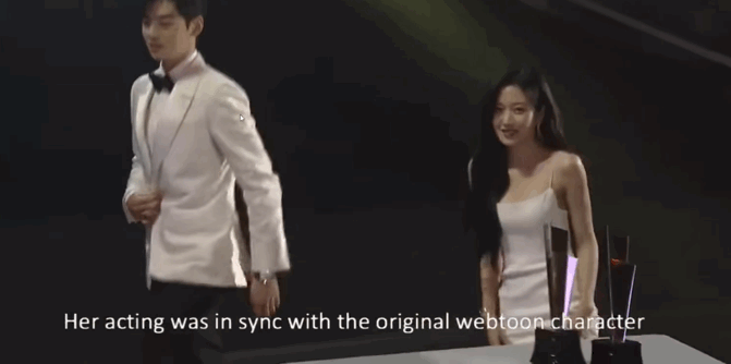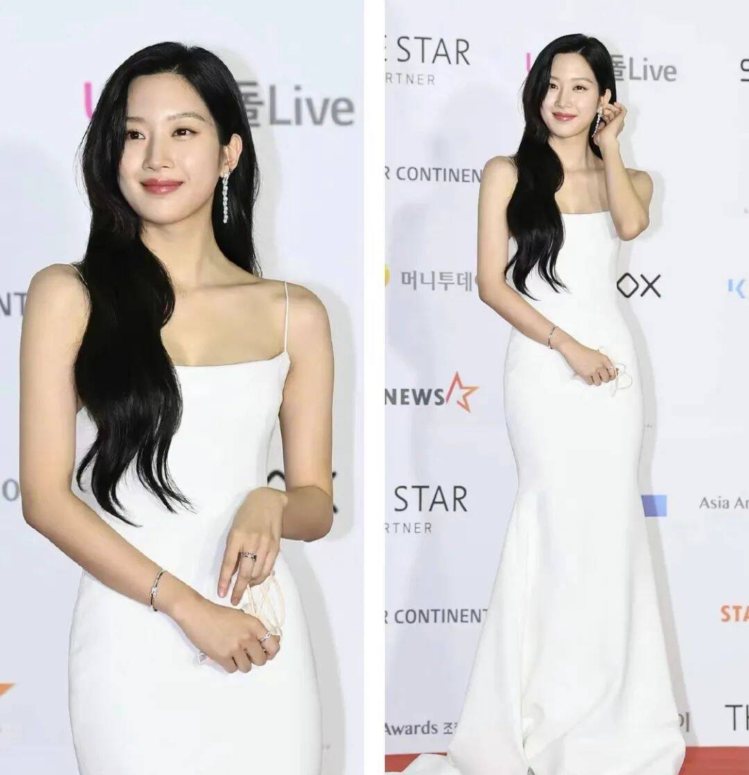 在AAA颁奖典礼当晚,她还与《女神降临》的cp车银优一同上台领奖,两位内场都身穿白衣,非常登对。