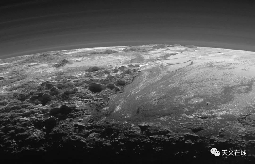(冥王星诺盖山脉(左侧前景)、希拉里山脉(左侧天际线)以及史波尼克高原(右侧)的景象。邻近日落时分可见大气中弥漫着层层叠叠的烟雾。)