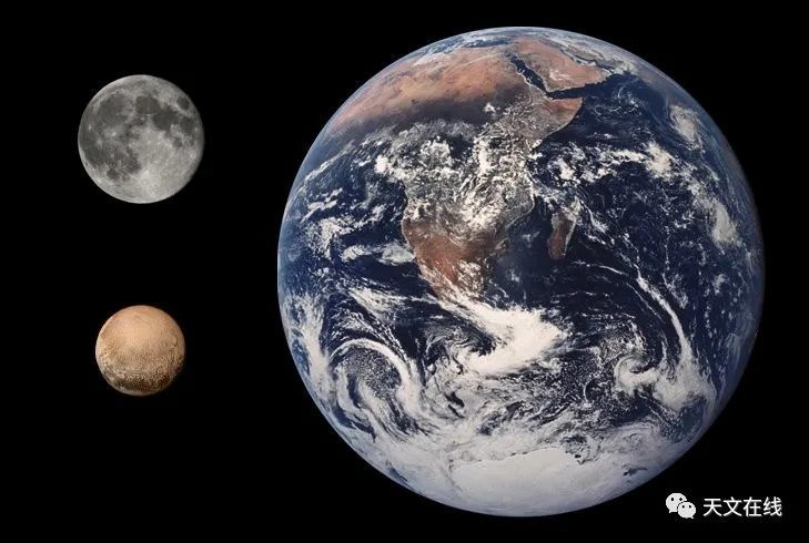 (地球、月球、冥王星(左下)的比较。冥王星的体积是地球的0.6%。)